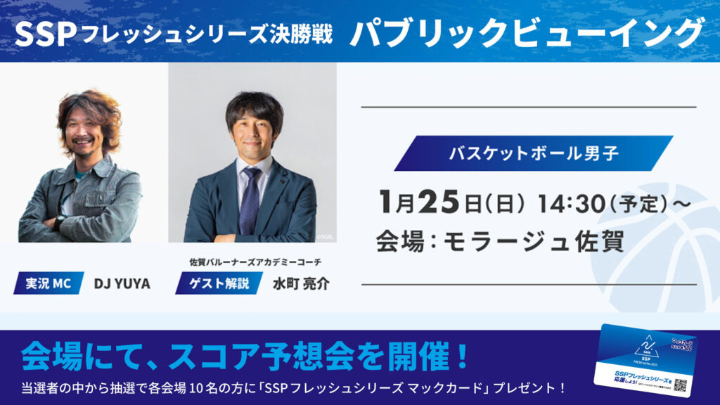 モラージュ佐賀にて、「SSPフレッシュシリーズ 男子バスケットボール決勝リーグ」のパブリックビューイングを開催します!